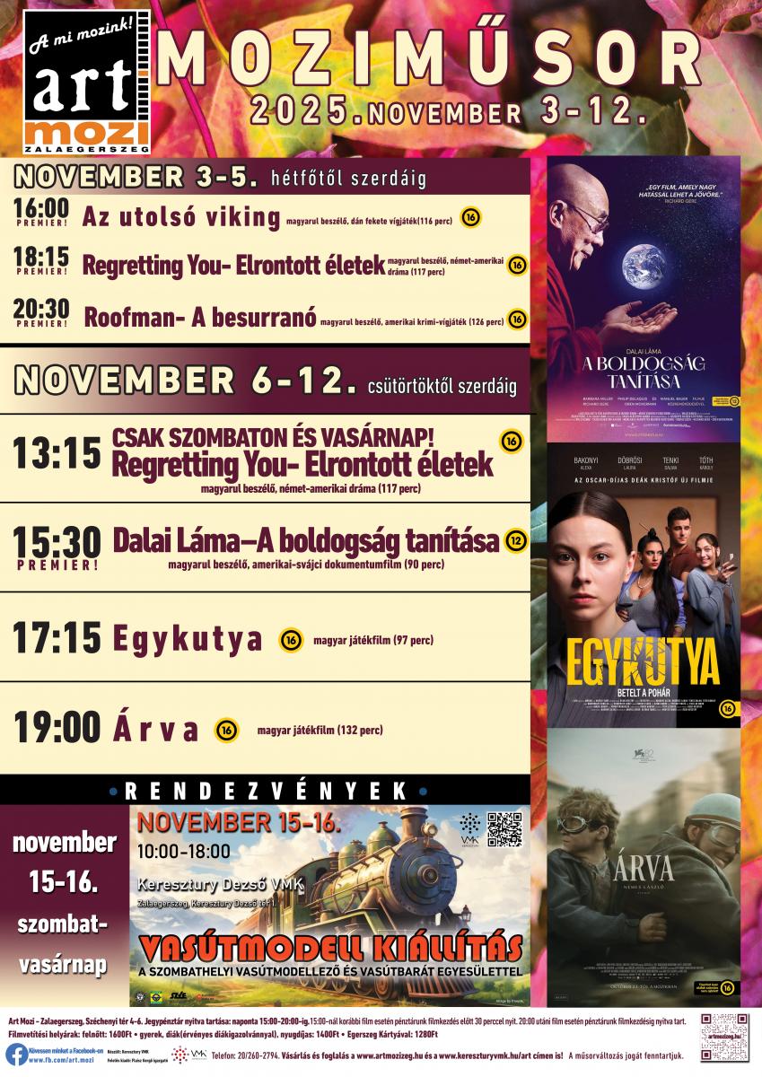 Jegypénztár nyitva tartása: naponta 15:00-20:00-ig. 15:00-nál korábbi film esetén pénztárunk filmkezdés előtt 30 perccel nyit. 20:00 utáni film esetén pénztárunk filmkezdésig nyitva tart. Telefon: 20/260-2794. Vásárlás és foglalás a www.artmozizeg.hu és a www.kereszturyvmk.hu/art címen is!