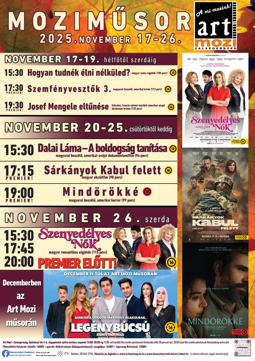 Jegypénztár nyitva tartása: naponta 15:00-20:00-ig. 15:00-nál korábbi film esetén pénztárunk filmkezdés előtt 30 perccel nyit. 20:00 utáni film esetén pénztárunk filmkezdésig nyitva tart. Telefon: 20/260-2794. Vásárlás és foglalás a www.artmozizeg.hu és a www.kereszturyvmk.hu/art címen is!