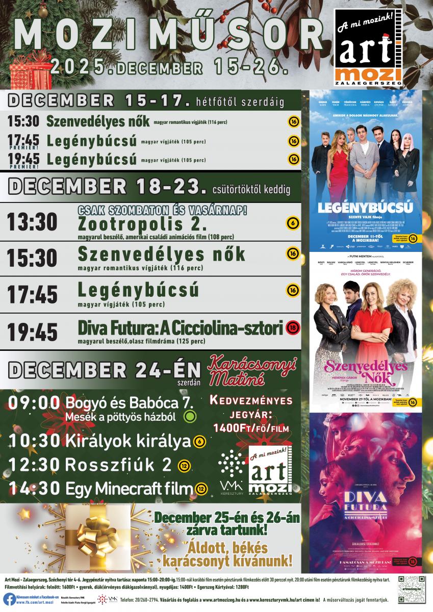 Jegypénztár nyitva tartása: naponta 15:00-20:00-ig. 15:00-nál korábbi film esetén pénztárunk filmkezdés előtt 30 perccel nyit. 20:00 utáni film esetén pénztárunk filmkezdésig nyitva tart. Telefon: 20/260-2794. Vásárlás és foglalás a www.artmozizeg.hu és a www.kereszturyvmk.hu/art címen is!